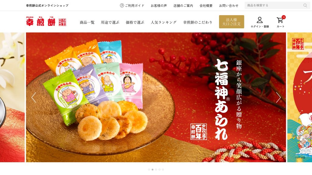 最大の変化は、主力商品「七福神あられ」の各シリーズを用途別・価格別・ランキングなどから選べるようになったことです。